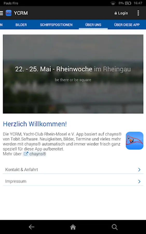 Now there is the Yacht Club Rhein-Mosel eV for the app's smartphone! All news, photos, events and webcam images will instantly in your pocket. Whenever there is something new that's ringing on your phone. And if a professional ship at Club passes by, the name, speed, and much more can be displayed live in the app.
