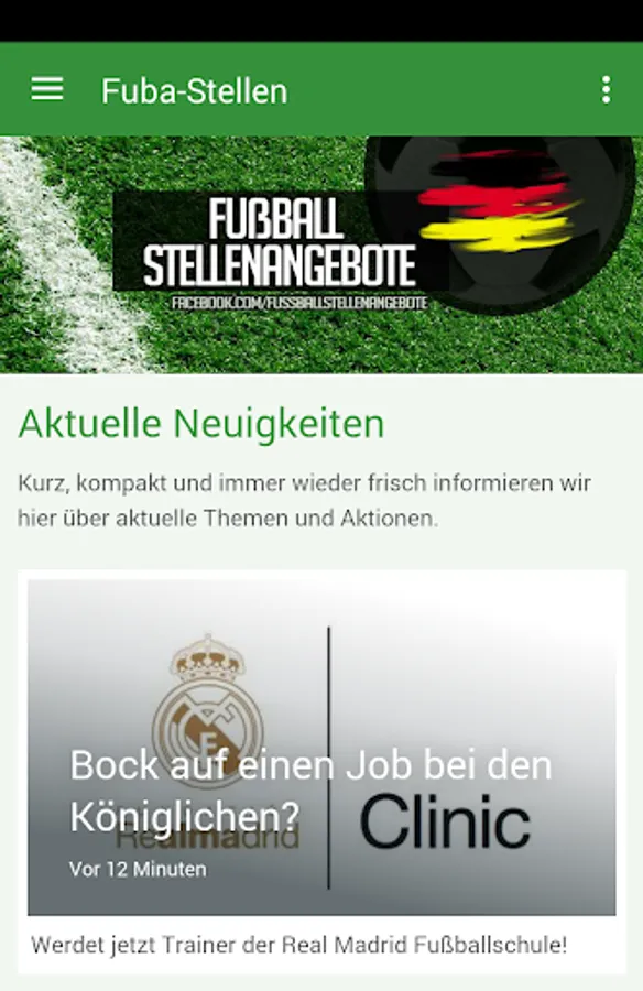 Now there's Fuba sites as official app for Smartphone's! All Football Jobs united on one side. www.fussball-stellen.de. All new posts will instantly in your pocket. Whenever there is something new that's ringing on your phone. And because a smartphone is just a phone, a button can be equal to establish a connection. The Fuba Spot app always provides a direct line.