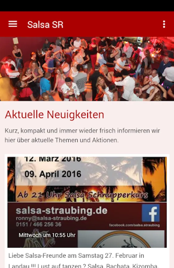 The official SALSA Straubing smartphone app is here! Stay up to date on his salsa parties, workshops, dance classes, photos and news. Through the push function, there's all the news directly to your smartphone. It's never been easier to make a direct connection by pressing a button.