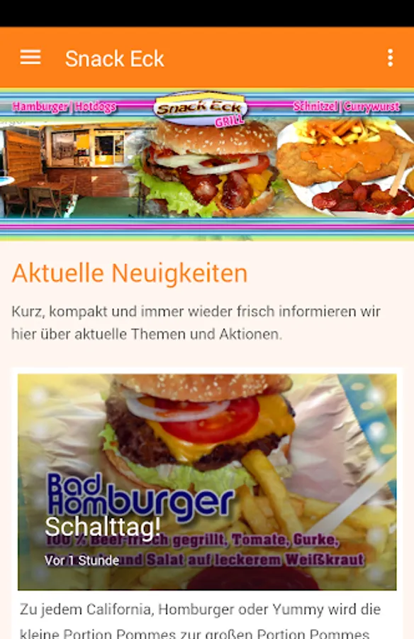 Now there's Snack Eck as official app for Smartphone's! All news and offers come directly to your mobile. So no one missed the delicious hamburgers, schnitzel and hot dogs. Whenever there is something new on your phone's ringing. And because a smartphone is just a phone, can be a button equal to make a connection. The Snack Corner app always provides a direct line to treat ...
