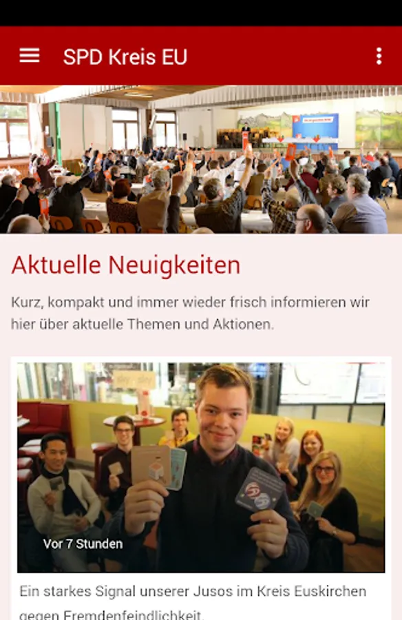 Now there's SPD district EU official app for Smartphone's! All news, photos, events and dates end up directly into the pocket. Whenever there is something new that's ringing on the smartphone. And because a smartphone is just a phone, can be a button equal to establish a connection. The SPD district EU app always provides a direct line.