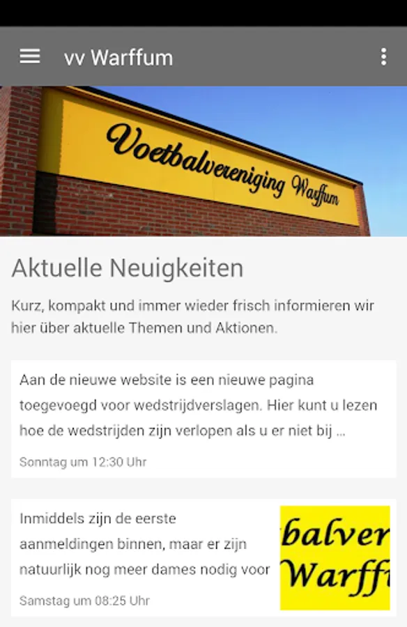 Nu is er vv Warffum as officiële app voor smartphone! Al het nieuws, foto's, en gebeurtenissen afspraken loaded ends zo direct in de broekzak. Bij elk nieuws rinkelt de smartphone. Omdat een smartphone nu ook een telefoon eenmaal is, kun je met een druk op de knop een verbinding was dead brengen. De vv Warffum app garandeert een directe lijn.