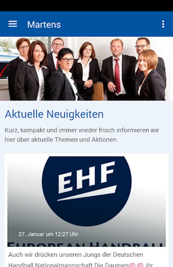 Now there Martens insurance industry as an official app for Smartphone's! All news, photos, events and dates end up directly into the pocket. Checklists, Claims and Service Aids always there and as an added value: Bundesliga Champions League + Tables with Sweepstakes. And because a smartphone is just a phone, can be a button equal to establish a connection. The Martens App always provides a direct line.