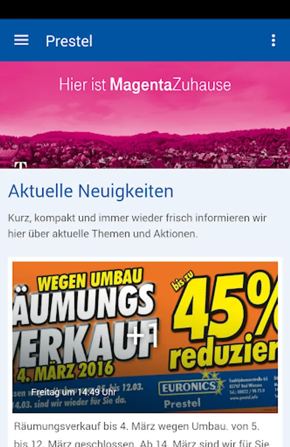 Now there is Euronics Prestel as official app for Smartphone's! All news, events, photos, events and dates land so directly in your pocket. Whenever there is something new that's ringing on your phone. And because a smartphone is just a phone, a button can be equal to establish a connection. The Euronics Prestel app always provides a direct line.