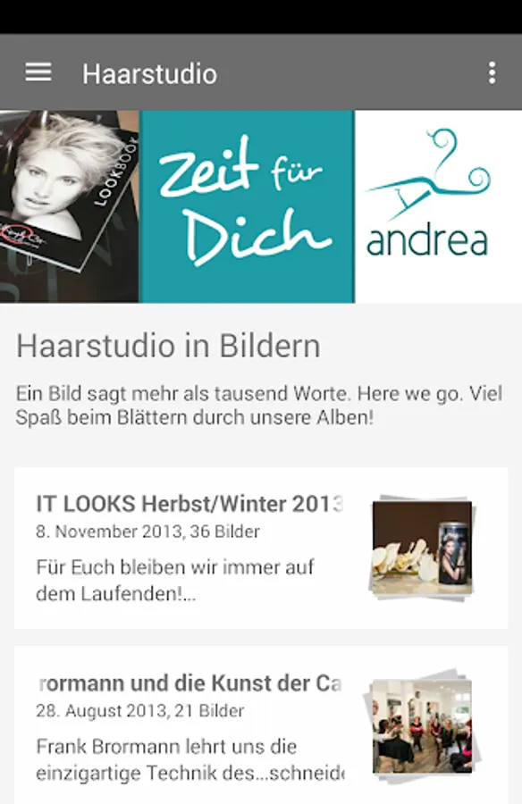 The team at Hair Studio Andrea now brings all the latest information on the latest styles and trends straight to your smartphone. With our new app you get in the future via a dedicated line all brand new hair care tips, great color combinations and hairstyle trends fresh from the salon directly to your home.