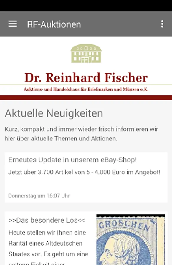 This is the official app from the auction house Dr. Reinhard Fischer of Bonn. An auction and trading house for stamps and coins with a market experience of over 30 years.