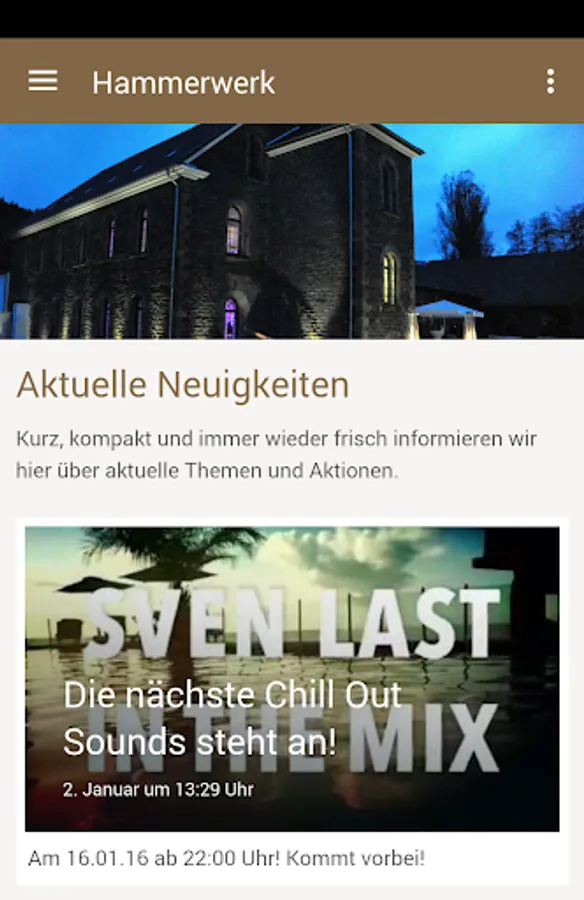 Now there Gallery Hammerwerk as official free app for Smartphone's! All news, photos, event dates land so directly in your pocket. Whenever there is something new on your phone's ringing. And because a smartphone is just a phone, can be a button equal to make a connection. The hammer-app always provides a direct line.