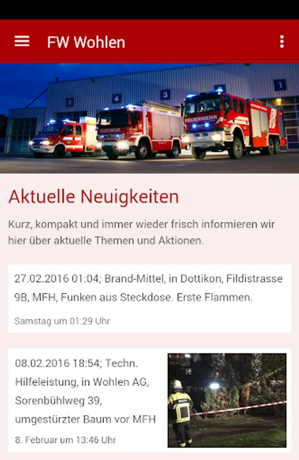 This is the official fire service app Wohlen! You can find all information about the fire Wohlen, all appointments, impressions and images. Your fire department Wohlen.