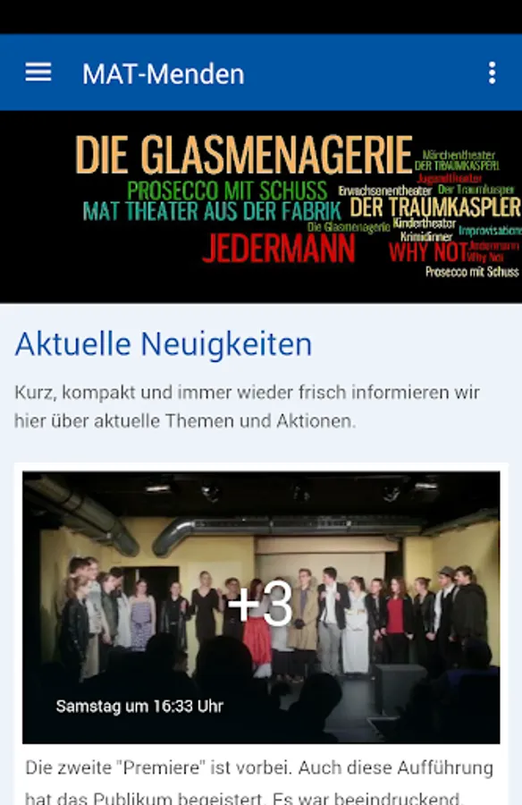 The M.A.T. exists since 1958 and since the 2003/2004 season we have our own, small theater with 49 seats in a former factory. In addition to the adult theater there with us a group of children that goes every year with a fairytale tour. Our youth group staged regularly once a year pieces just for teenagers, where the classics of the theater are very popular here.