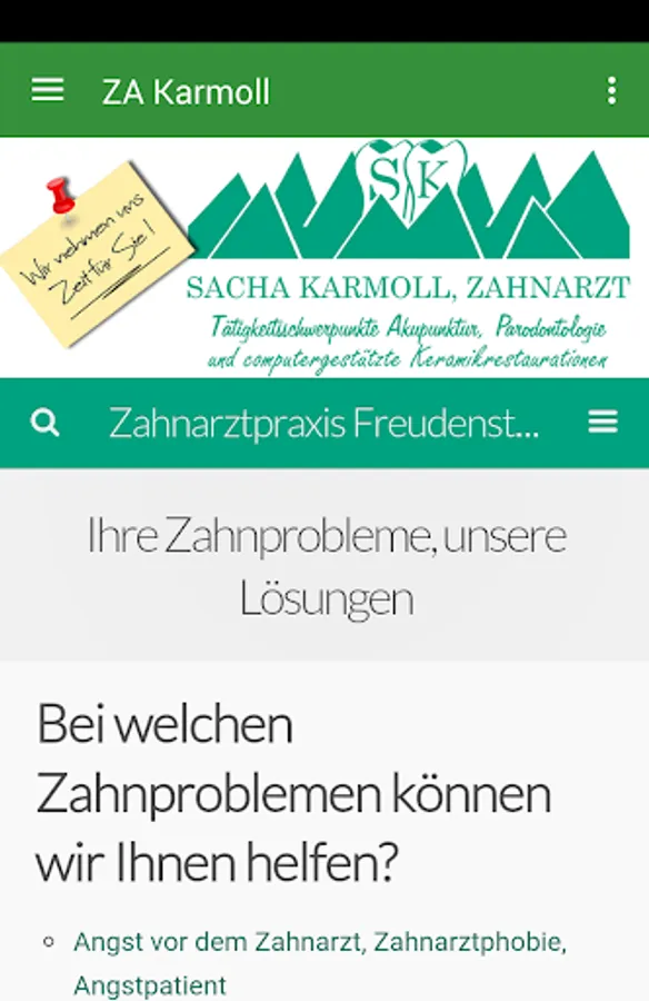 About our app information on all aspects of your dental health. From professional teeth cleaning, prophylaxis, on the treatment of anxiety patients with nitrous oxide sedation and Ohrakkupunktur up to the dentures in top quality and aesthetics.