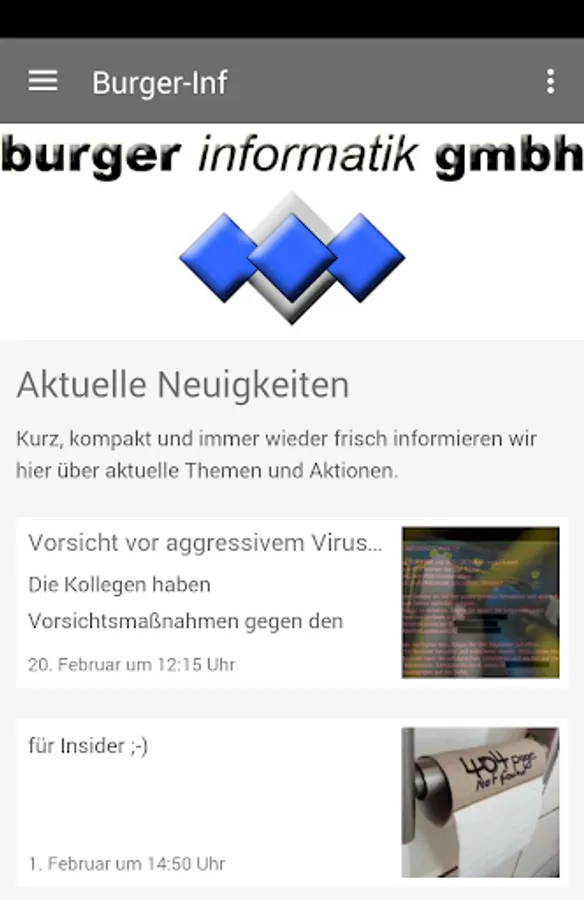 Burger Inf! The official smartphone app is here! All news, photos, events, dates at a glance, and always with you. Thanks to push notifications to stay up to date. Contact the back there is also, simply by pressing a button. Always have a direct line via this app.