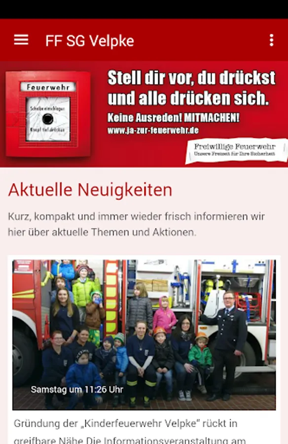 The volunteer fire department Samtgemeinde Velpke is now available as official app for smartphones, tablets and both web and mobile Edition. Dates, events and news are included with photos. Users are always up to date with the push service!