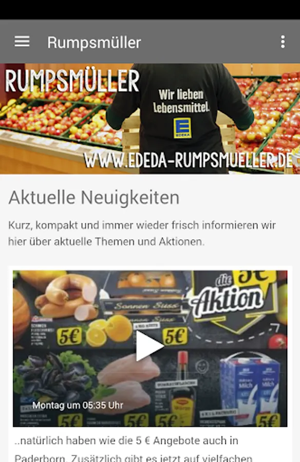 EDEKA Rumpsmüller operates several branches in the area Lippstadt and Paderborn. With the smartphone app, we want customers and prospects informed about the latest news. News about Rumpsmüller is available on request via push message directly to your phone. In addition, we present our own brands, indicate dates and publish photos about our stores and products.