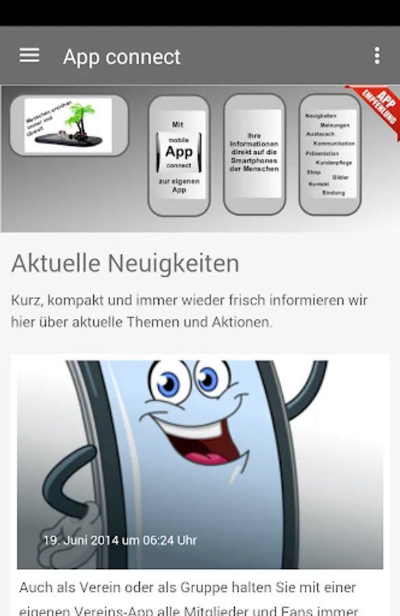 "Mobile app connect" brings your information directly to the smartphones of your target groups. With Chayns you sammels information from various channels like Facebook, RSS feeds and web sites and bring them directly to the people. Ideal for companies, associations and individuals. Ideal for anyone who has something to say.