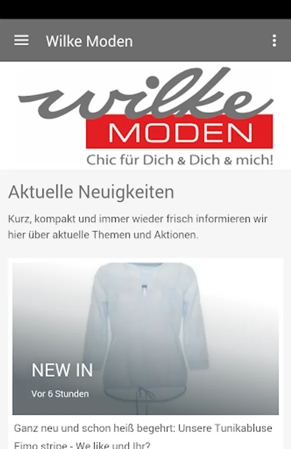 From now on there Wilke fashions as an app for your smartphone! All news, photos, events, dates at a glance, and always with you. Thanks to push notifications do not miss any more deals! Contact the back there is also, simply by pressing a button. This app connects people.