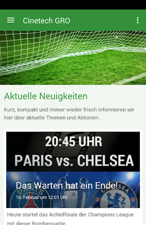 Welcome to our Sportsbar App of the Cinetech Gronau. Sport is the central theme that runs through all our lives. Whether active or passive, sports enthusiasts yesterday, love today and tomorrow the masses. We want to make our contribution to this and to present you with our sports-highlights up close and exciting. At this point, you can learn all about our current regular air dates and times as well as dates, facts and background information on selected sports highlights.
