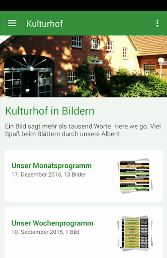 With the Kulturhof App you stay now stay up to date. Receive the latest news about our services or events. Have a look at our week or our monthly program, please contact us or register for events.