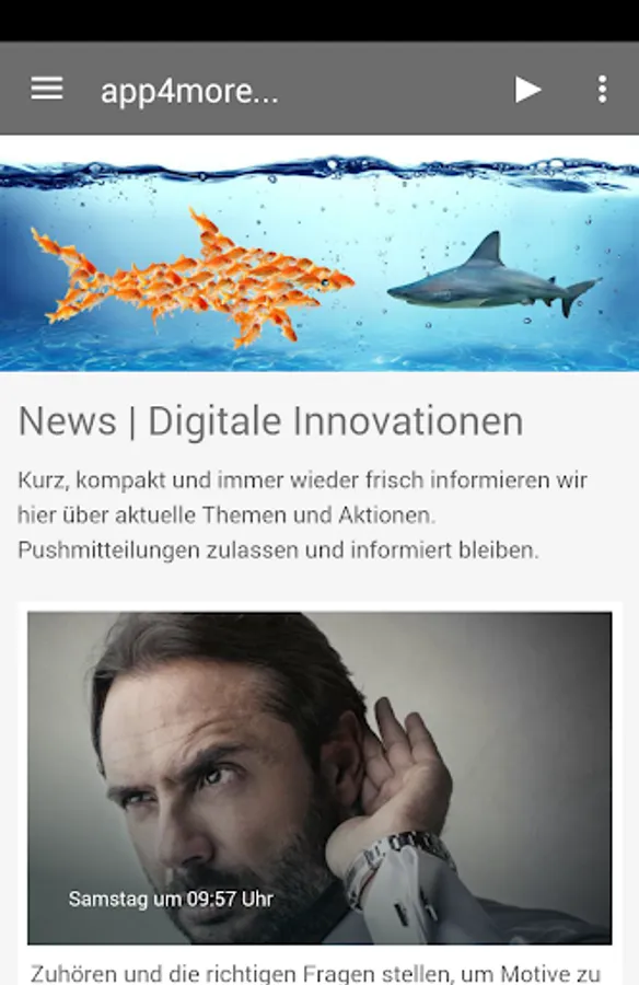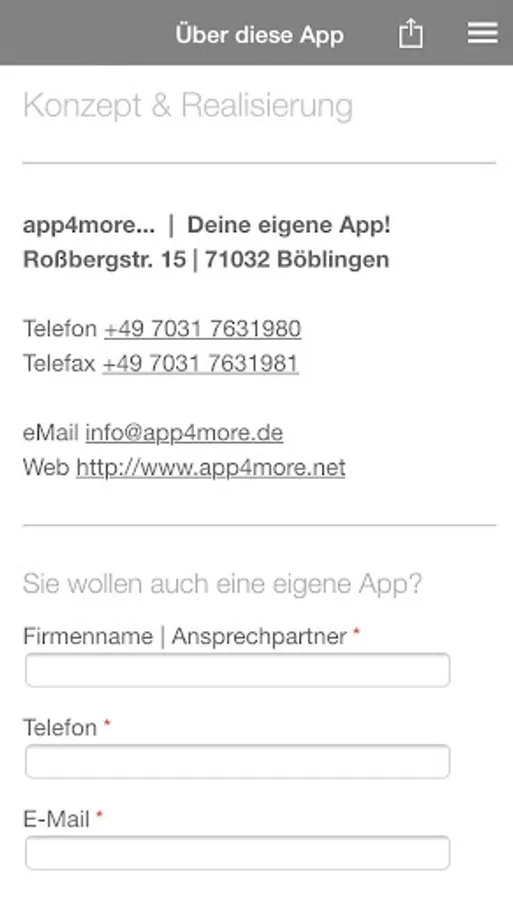 Please contact us for your personal and vivid APP. So you end up with your advertising and information always directly in the pockets of your customers or whomever you want to achieve. Download our app on your smartphone and get a picture of how this might look. We are pleased to create your own personal and vivid app for you. Appige Greetings, Your team of app4more ...