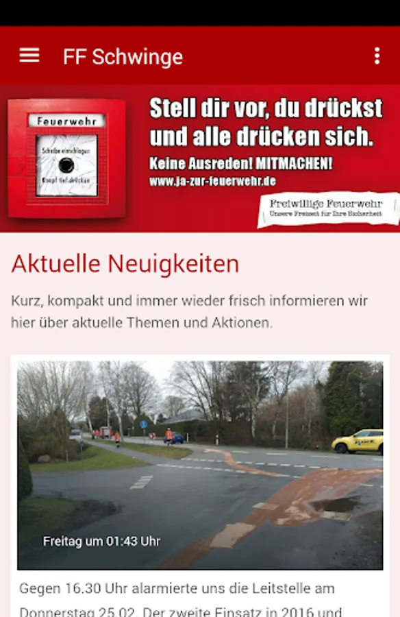 The volunteer fire department rocker (LK Stade) hereby would like to introduce. This app is intended to inform all interested citizens on the activities and operations at our place. We can be found outside the app under www.ffschwinge.de.