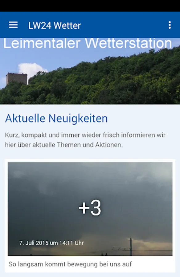 The Leimentaler Weather Station is a private weather station for 12 years to record weather data. The station is owned by Oliver Handschin companies. Live weather data with three days weather forecasts. The station is located in Leimental in Flueh Canton Solothurn.