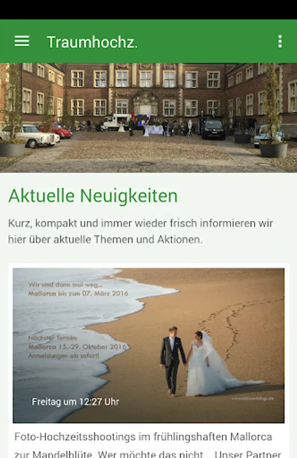 The app of Ahaus dream wedding day offer future, fresh but already long happy together wedding couples lot of information on the subject of "marriage". Whether his own wedding in planning is a dress for your best friend should be chosen or you simply would like to reminisce about the big day, here you can find the latest collections and information: on Bridal, jewelry, wedding rings, hair styling saloons, Photography, Floral, Print, Travel, Men's fashions, evening fashions, music, gastronomy, card making, gifts, cakes and much more
