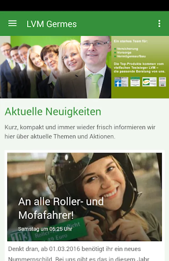 Your LVM insurance agency Bernd Germes in Straelen is available as an app for your smartphone. So you have one-click updates to all insurance and health topics, photos, events and dates at a glance. Please allow under Settings sending push notifications, so you will not miss any info. Good connections are important to us. You can call us with your smartphone like, or navigate to us for a cup of coffee in the Town Hall Road 44. LVM Germes - we are always here for you.