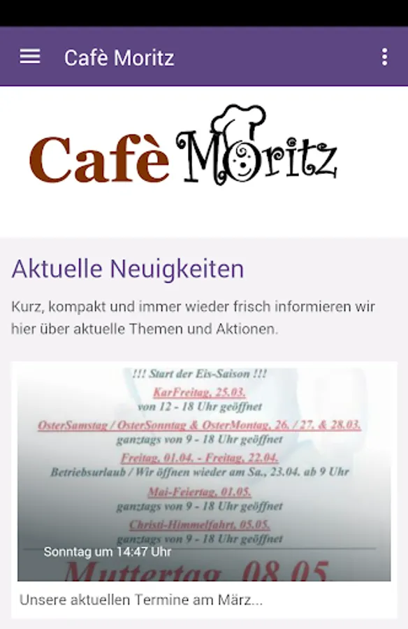 Welcome to our app Cafè Moritz Hildesheim! With our app you are always up to date ... learn our cakes and tarts range, you informed about our current opening times (even on holidays), and and and!