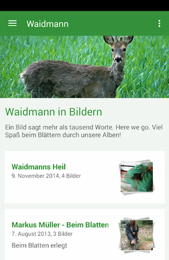 This page is for avid hunters and hunting! Show us your best pictures and videos! Share with us your favorite moments of the hunt and post your hunting trophies on the wall! First log in to the App! Only for fans of Waidmanns salvation!