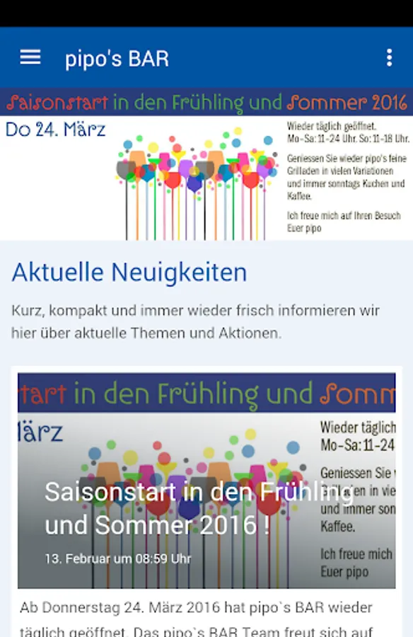 With this app you're always up to date with what is going on in pipo's BAR. You can find everything about the opening times, the upcoming events and are up-to-date on special offers, competitions etc.