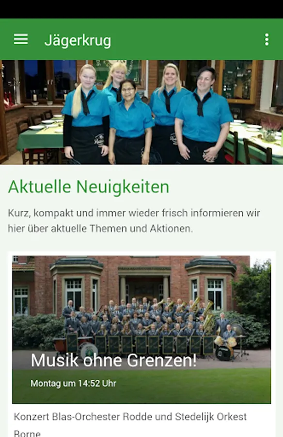 The Jägerkrug in Rheine is now available as a smartphone app. Always stay up to date on events, dates, pictures and news via push notification! And the personal contact you can easily produce a button.