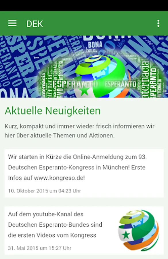 The conference app of the German Federal Esperanto is specially designed for participants * inside and those interested in the German Esperanto Congress. Using the app is informed of the planned program but also the latest news and changes. In addition, we test out other possibilities, such as a chat or compose your own reports / posts directly by Congress.