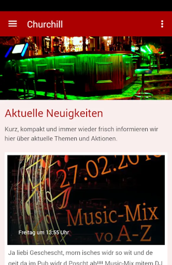 This app serves our customers to stay up to date with what's on Churchill Pub such Event of Use and Kornzerte will be like a pair of images from the pub and the party's are published to see.
