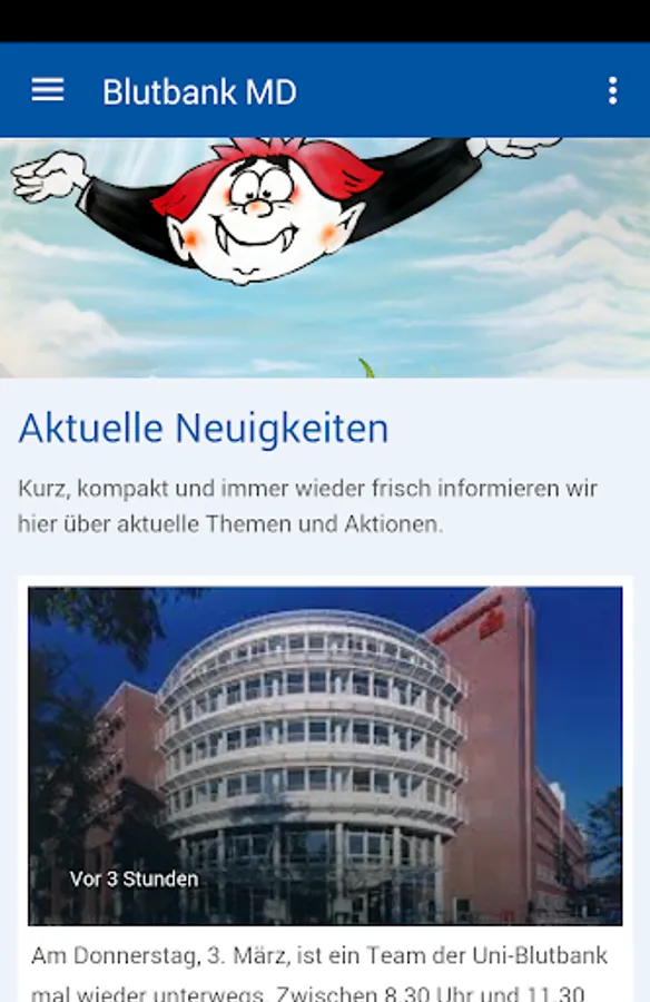 As blood donation Institute of the University Hospital Magdeburg A.ö.R we are responsible for the adequate supply of all patients in the hospital with blood products. With the app, we would like to inform you about the issue of blood donation, call attention to promotions, events and appointments in the university blood bank and facilitate communication with the blood donors and blood donors and blood donors with each other.