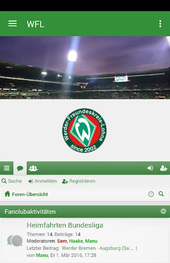 The top priority of the association is many Werder fans from Lohne and to provide for the opportunity to attend football matches of SV Werder Bremen. An attempt is made to offer cards for members and interested parties as well as a bus ride from Lohne at every home game. Selected Away trips are organized several times a year. In recent years, the club traveled support by Germany for Werder Bremen from. The Werder friends from Lohne home is the East Stand at the Weserstadion.