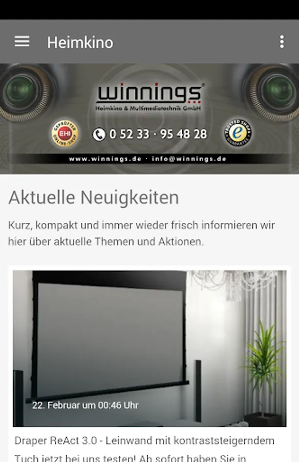 Winnings home theater & Multimedia App. Get up to date and fresh all information, images, new products, events and promotions around the topic of home theater, projection, 3D and 4K. Be at current prices and actions of the first and keep in touch through the App Info. Winnings has now more 9 years an institution in the field of consumer electronics. Screens, brackets, BluRay and complete systems you get from us, as well as expert advice. Look in our home theater studios in 32839 Steinheim and let yourself be inspired.