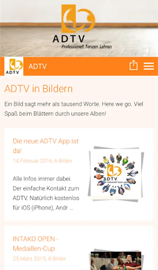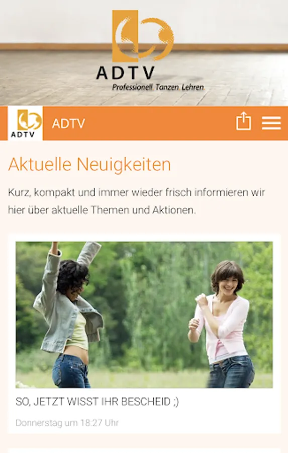 Most Germans learn to dance in one of the over 860 ADTV dance schools. ADTV, which is the General German Dance Teachers Association e.V., the largest association of its kind in the world with over 2,800 members throughout Germany. This app gives you information about the association, as well as actions in ADTV dance schools.