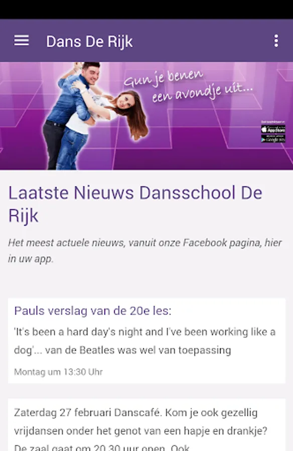 Volg de laatste nieuwsfeiten en het check lesrooster van Dansschool De Rijk, Nieuwegein. De app is een aanvulling op de website www.dansschoolderijk.nl.