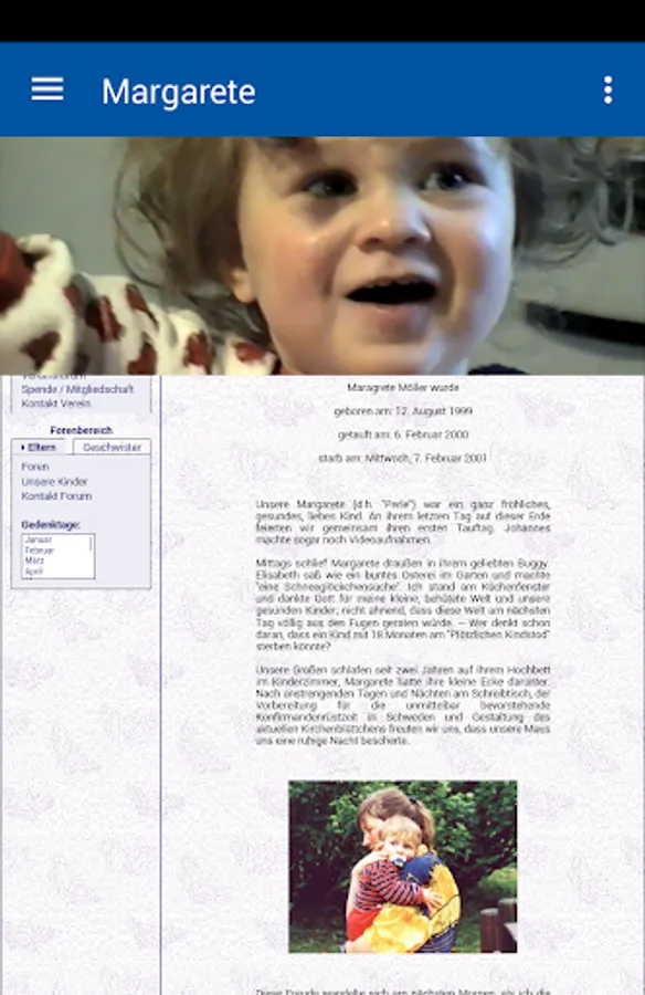 This is an app in memory of Margaret Möller Syhra. Here reminder posts are at their memorials, such as birthdays, baptizing Agen, death days or days set names, etc.. In addition to comforting texts, images and music appear regularly on this app, the other werwaisten parents can be a help. Also invited to special events for mourning the loss of children. You'll be surprised! :)