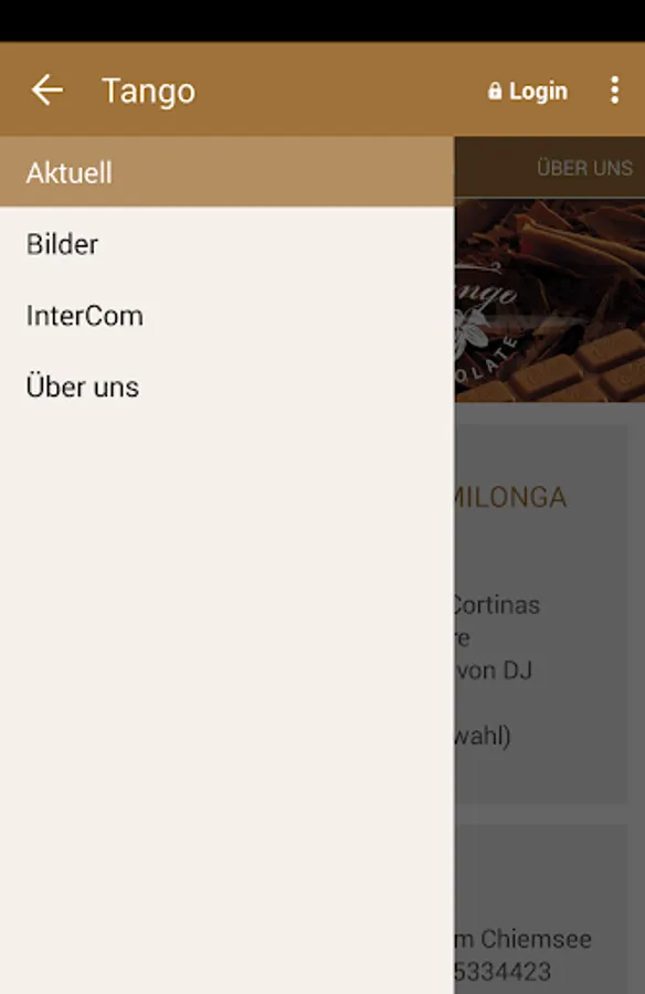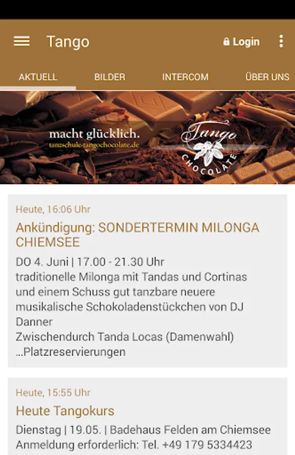 The app provides information on dates of courses and events of milongas and concerts in the area Holzkirchen - Wasserburg - Rosenheim - Traunstein - Bernau - Kufstein