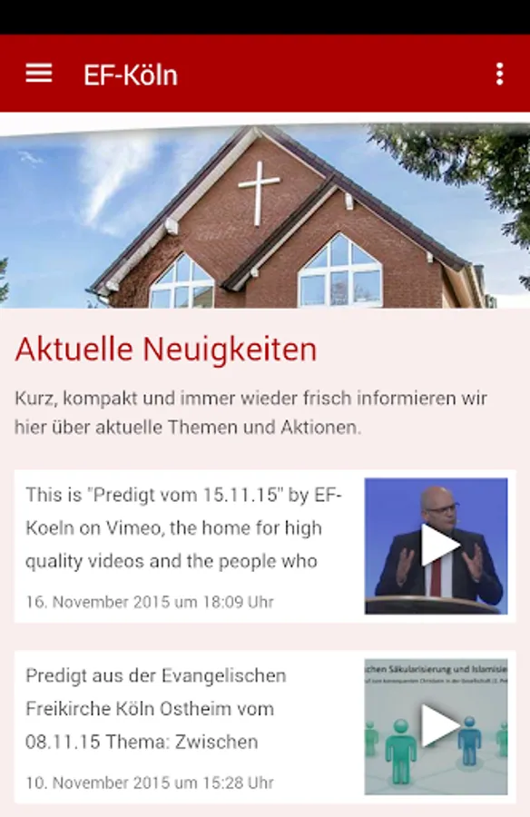 We are the Evangelical Free Church of Cologne Ostheim. We intend to expand modern communications and reach even more people about this app. The following categories are planned at the moment: news, events, photos, contact details and directions how to get to us.