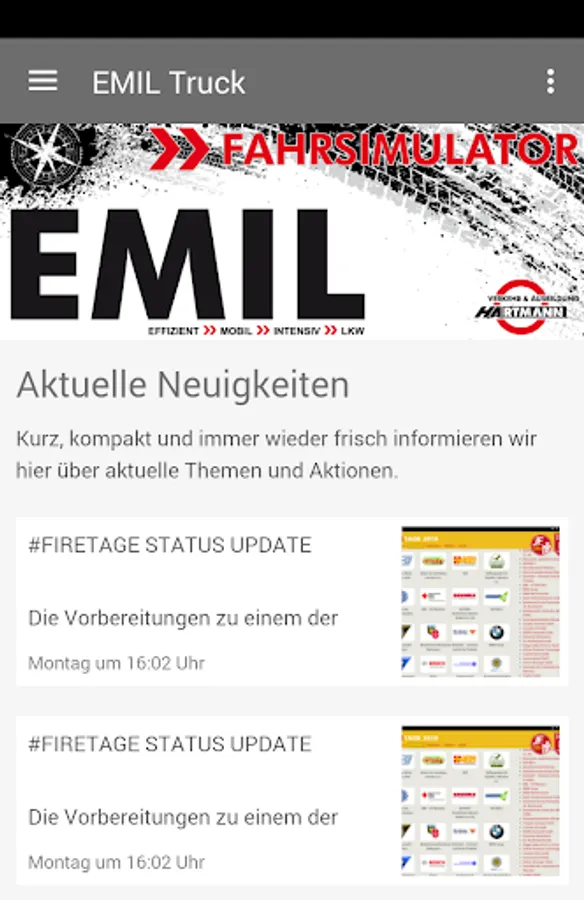 "We are bringing security to the streets" is much more than a slogan. Emil, the driving simulator of Transport & Training Hartmann to use trips can just train as efficient truck driving. With our app, there's always the latest news and events around EMIL. Also articles, statistics and more inform.