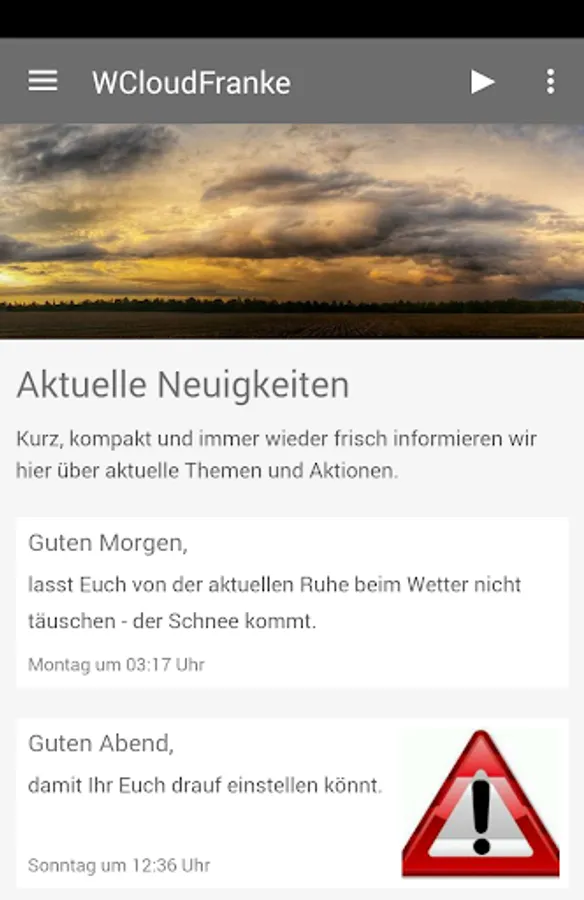 Weather warnings. Weather forecasts for Franken. Also tips and tricks for outdoor activities, as well as recommendations on leisure activities in Swiss francs. Also we are in appropriate weather conditions to provide detailed information for you. Warnings are i.a. from the official warning services or of our partners also own warnings. Your weather pictures can you tell us, of course, also via PM on Facebook or via email to come for publication lassen.Die all information are displayed via push notification on your mobile phone, so that you do not miss messages when you're on the go. We are gradually further feature by Tab Add the app such as Doppler radar, Blizuortung ect. Use of the app does not necessarily require a Facebook account.