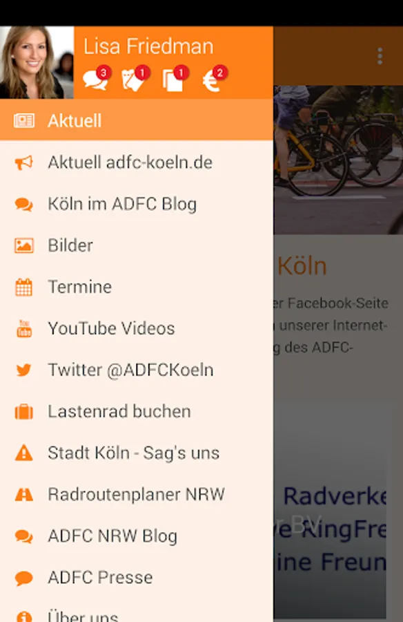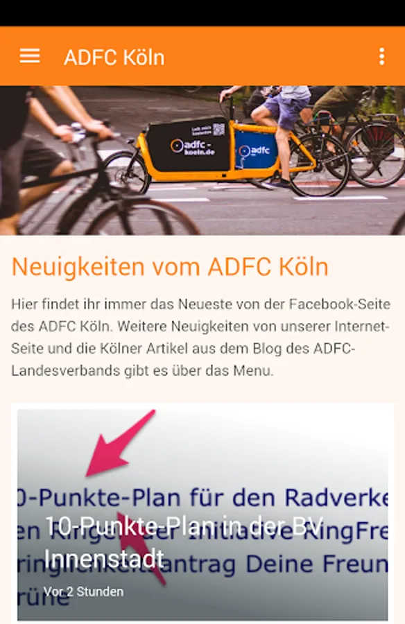 In our app, there are, among others News for ADFC from social media (even for people with no account with Twitter or Facebook), many appointments of our District Association and the Cologne Article from the blog of the ADFC Landesverband NRW.