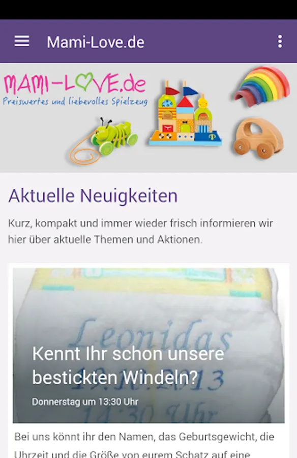 About this app you will receive all the information and news about new toys and trends. Mami-Love.de is your partner when it comes to loving toys for babies and toddlers.