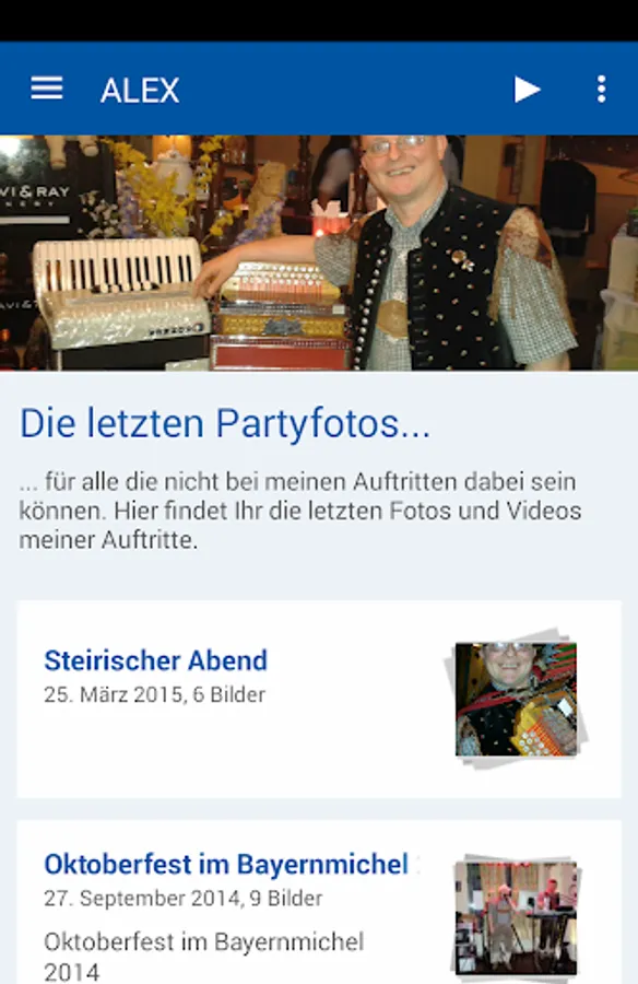 Entertainer Alex from Berlin - party atmosphere with the Styrian harmonica! About Wall where Alex shows up with his Styrian harmonica, there Party state of emergency. Oktoberfest atmosphere at its best ... And now all event photos and dates also on the go.