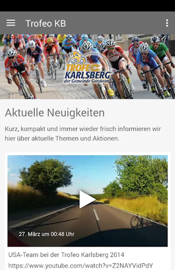 The Trofeo is the most important junior race in Germany and is part of the Junior Nations Cup of the International Cycling Union UCI. This app Provides complete information about the course of the race, results, traffic delays and Further information about the race. The user stay informed about activities in the social networks, without there having an account on the plattforms. A must for all cycling fans.