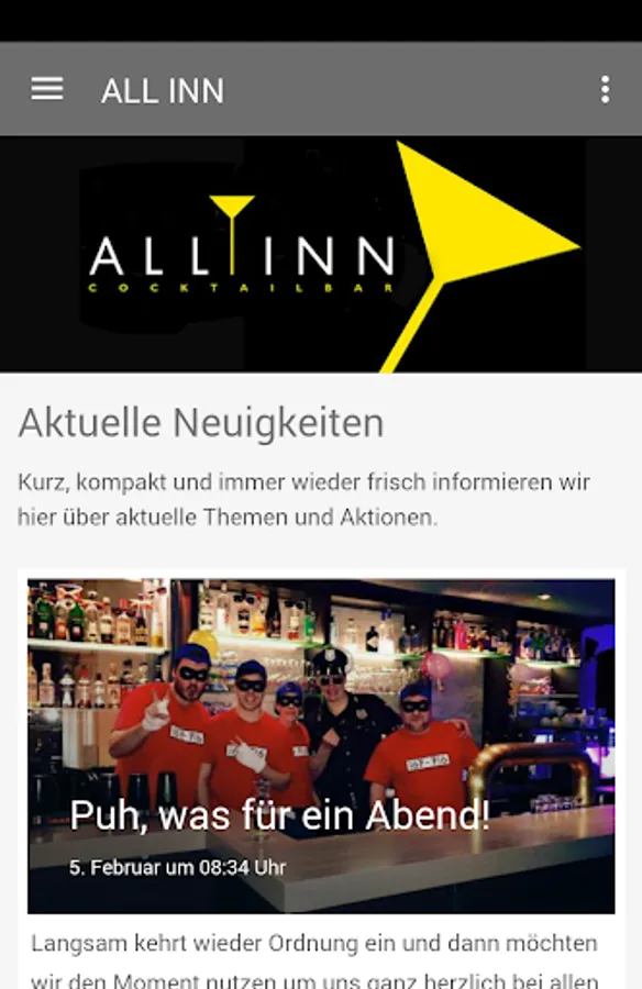 As the name suggests, we would like to bring together in our bar young and old, in a relaxed and informal atmosphere. Even in our APP. Here you learn more about the ALL-INN in Lemgo. News around the bar and its cocktails, finger foods, events, parties.