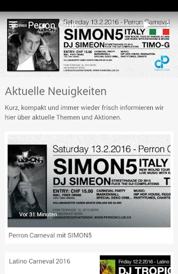 The big opening of Perron clubs and Bern City Lounge in Bern. Besides a lot of entertainment for the guests are offered a lineup of absolute top class. From cozy Deep House on House, Electro to urban beats everything will be heard this evening. From 22:00 to the club for all is open, before taking place on Friday for invited guests a VIP Apero instead. The app will keep you up to date with events, party pictures, videos, and tickets, Contacts ... much more.