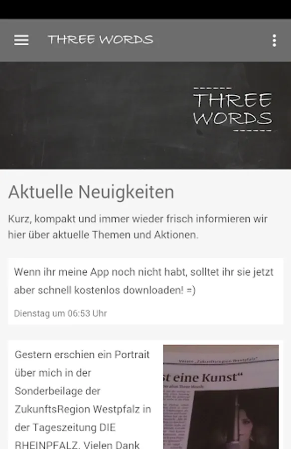 You want the latest songs, shows and reports the musician Three Words directly on your Smartphone? This works out! With this app you are always informed about the Black Rein from Kaiserslautern and get all the news directly in your pocket.