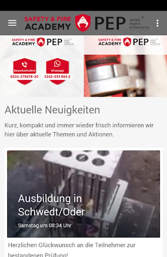 With the app you can keep yourself on schedule of our events or training courses to date. In the area you will receive exciting news information from the fields & SAFETY FIRE. Likewise, you can retrieve and apply the same like on the app all job offers in SAFETY & FIRE Academy. And if you want to get in touch with us - use our app!